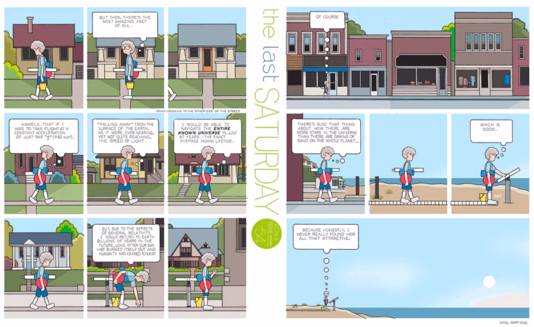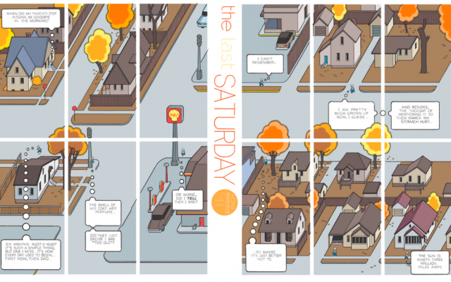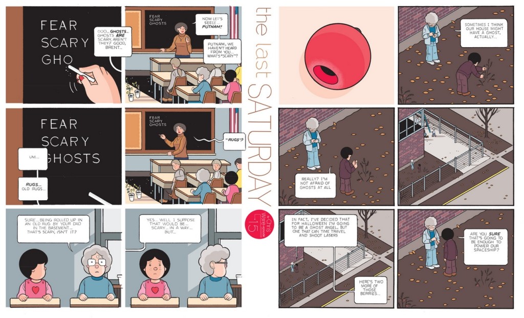 Tão aí as atualizações do quadrinho semanal que o Chris Ware publica no Guardian lançadas enquanto o blog estava de férias. Se quiser ler os capítulos anteriores de The Last Saturday, tá tudo aqui. Mais do que quando será publica a versão impressa, fico aqui pensando o formato do quadrinho. Imagino algo gigante, pra valorizar cada um dos painéis. Se cada um ocupar uma página, ainda não daria nem pro começo de um livro, mas não custa nada sonhar com isso no papel ainda em 2015, né?