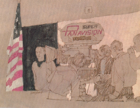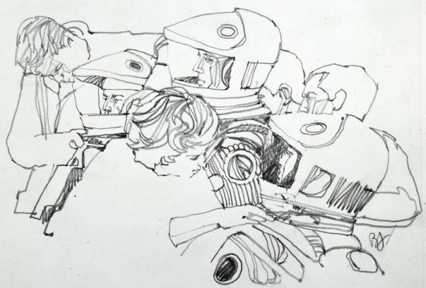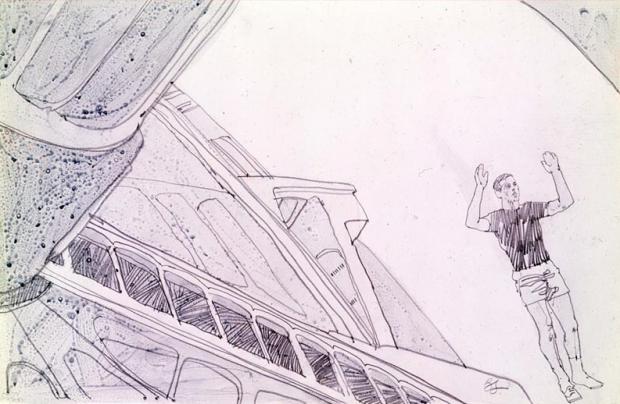 Essa história é demais. Em 1966, quando Stanley Kubrick começou a produção de 2001 – Uma Odisséia no Espaço, o diretor contratou um jovem artista de 29 anos para acompanhar a produção e ilustrar tudo que visse. Com o passar dos anos, esse artista acabou ficando famoso, o nome dele é Brian Sanders e um dos seus trabalhos mais recentes foi desenhar o pôster da 5ª temporada de Mad Men. Essa história não é novidade. Pelo que entendi, as ilustrações chegaram na internet em 2007, mas descobri hoje lá no The Film Stage. Tem mais desenhos no blog Kubrickonia e vale dar uma mexida no site do Brian Sanders. Coisa fina pra caramba. Ó: