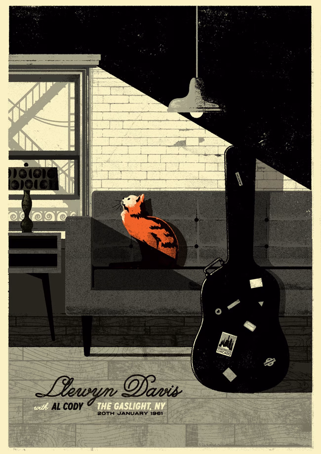 A edição da Little White Lies dedicada a Inside Llewyn Davis é uma das minhas preferidas da revista. No meio da publicação há sete painéis dedicados ao filme dos irmãos Coen, um deles é esse aqui em cima, produzido pelo estúdio Telegramme de Londres. Sempre achei linda essa arte e voltei a esbarrar com ela hoje, quando vi que o pessoal da série Criterion utilizou a mesma imagem na capa do blu-ray da produção. Enfim, isso tudo é só uma desculpa pra reproduzir a ilustração por aqui e deixar o blog mais bonito.