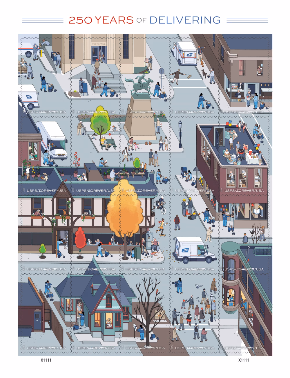O US Postal Service, empresa de correio dos Estados Unidos, está celebrando seus 250 anos de existência com essa arte aqui em cima, assinada pelo quadrinista Chris Ware. A imagem retrata, em um único painel, os serviços de uma carteira norte-americana ao longo das quatro estações do ano. A arte foi recortada em uma série de 20 selos que estarão à venda ainda em 2025, em data ainda a ser anunciada (agradeço ao Érico Assis pelos links).