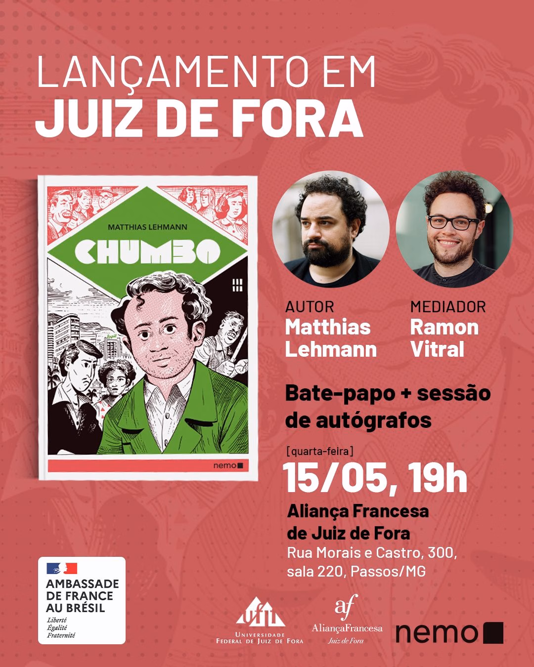 Ei, você de Juiz de Fora, tem programa para amanhã (15/5), às 19h? Vou mediar uma conversa com o quadrinista francês Matthias Lehmann, autor de Chumbo (Nemo) na sede da Aliança Francesa (R. Morais e Casto, 300, sala 220, Shopping Alameda). O evento é de graça, só chegar. E depois rola sessão de autógrafos.