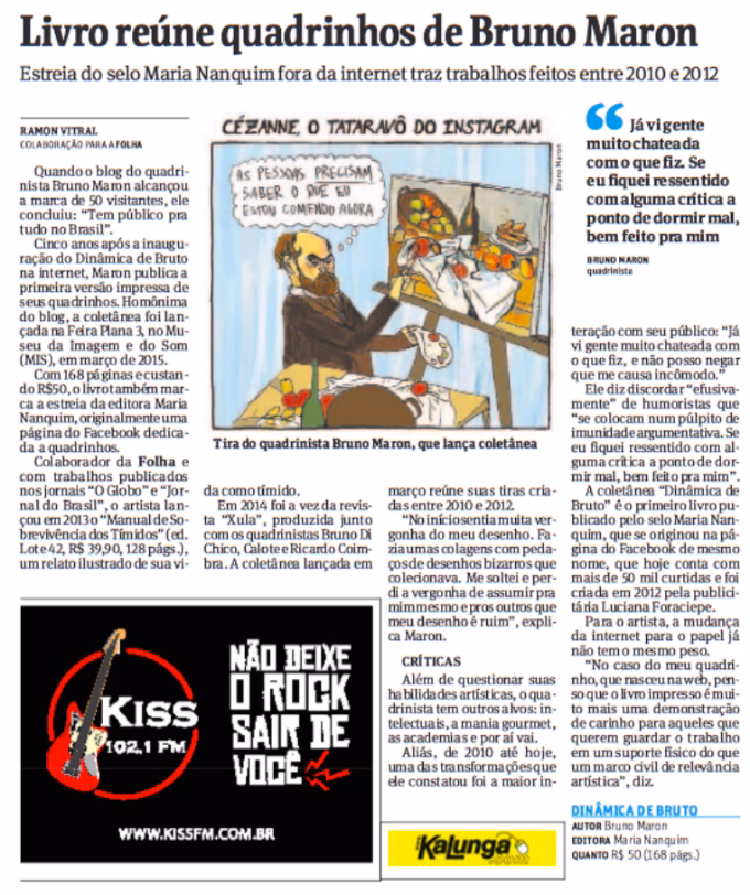 Quando 2015 chegar ao fim, outro livro que vai estar na lista de melhores HQs de muita gente é o primeiro volume do Dinâmica de Bruto. A coletânea reúne os primeiros três anos de tiras do quadrinista Bruno Maron. Conversei com o artista no começo de março e a matéria foi publicada hoje na Ilustrada da Folha de São Paulo. Em breve posto por aqui a íntegra da entrevista. Segue o texto que saiu no jornal e um extra exclusivo do blog, um papo rápido com a Luciana Foraciepe, editora do livro e dona da página Maria Nanquim.