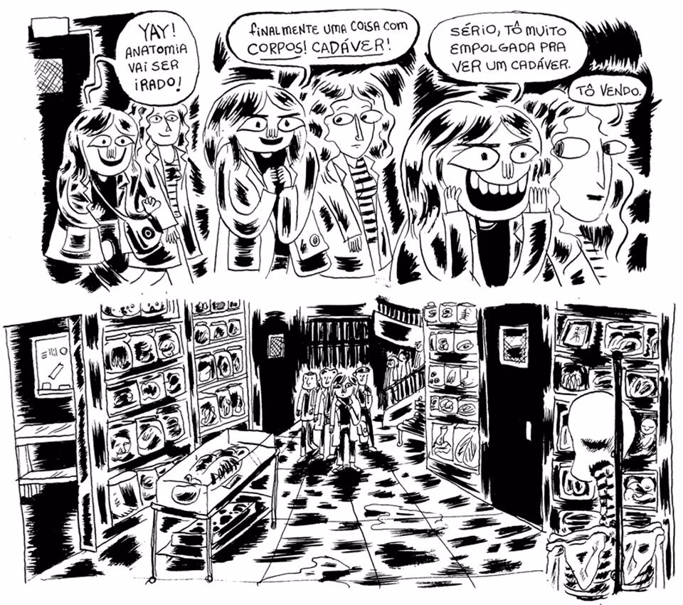 Também recém-lançado na França, pela editora Vraoum!, com o nome de Carabin & Caipirinha, Estudante de Medicina começou a ser produzido por Cynthia quando ela ainda estava na faculdade. A obra foi finalizada durante o período da artista como uma das residentes da Maison des Auteurs na cidade de Angoulême, onde ela ainda reside atualmente. Conversei com a quadrinista via Skype sobre a produção do quadrinho, suas principais reflexões durante a criação do álbum, as tramas pessoais tratadas por ela na HQ e o conteúdo científico do livro. Papo bem bom. Ó: