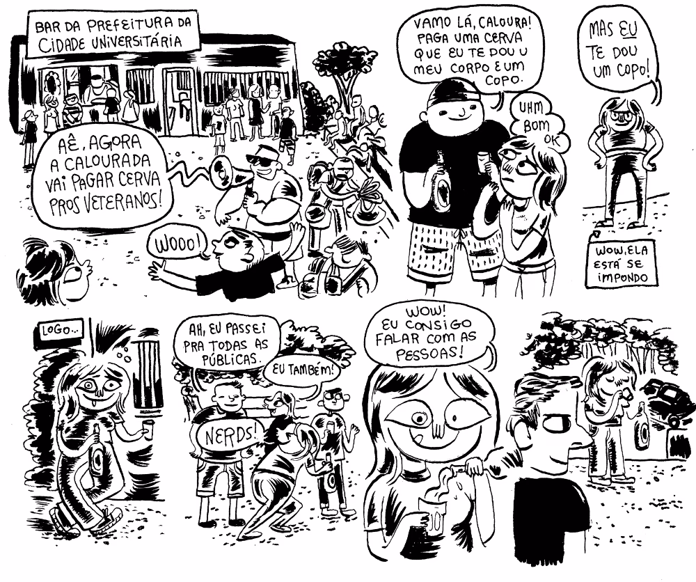 O Joe Matt falou sobre isso numa entrevista. Alguém perguntou como ele conseguia namoradas, porque pelos desenhos é o maior filho da puta do mundo. Ele falou isso que eu falei: “sou eu, eu sou um filho da puta, não tô dizendo que não sou, mas lá eu sou um personagem, me dá prazer em fazer ele ser filho da puta”. A minha personagem não é filha da puta, mas é o mesmo distanciamento que eu queria ter e rolou.