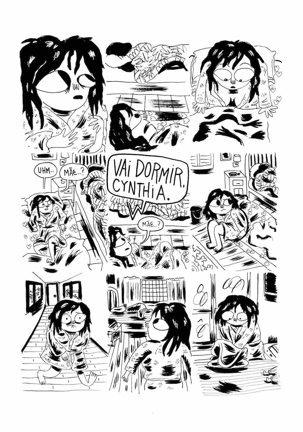 Eu ia fazer colorido, mas pra falar a verdade quando eu estava fazendo… Tipo assim, me deu um medinho e o editor francês disse que queria em preto e branco, acho que também por ser mais barato, e na real fiquei meio aliviada. É o primeiro livro e eu já estava surtando com tanta coisa (risos), quando ele disse que não precisava das cores eu disse “Ok, então beleza! Então concentro no preto e branco e tá tudo bem”. Fiquei meio grata de ser em preto e branco e eu curto o gibi em preto e branco, não sinto falta de cor.