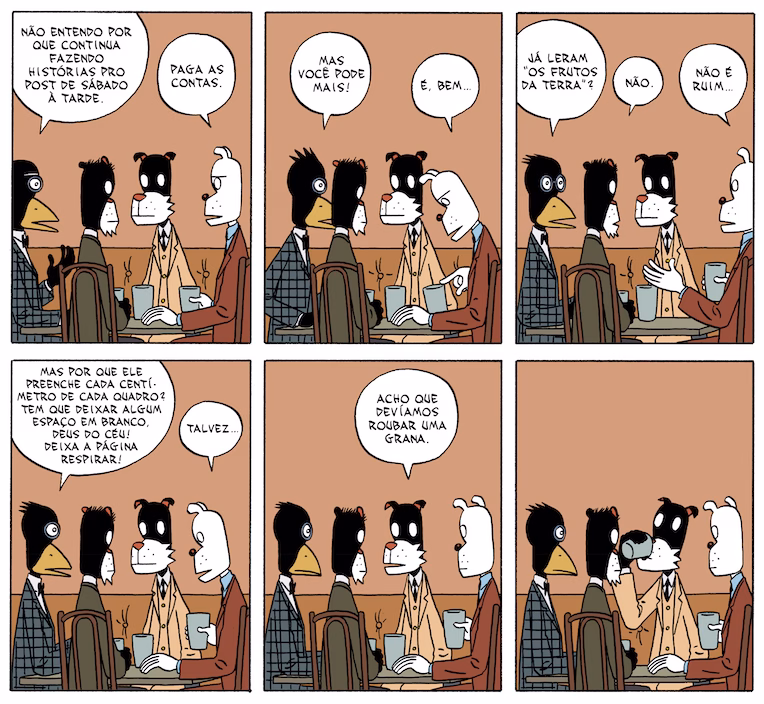 “Por que a gente faz quadrinho?”, questiona Ezra Pound a Ernest Hemingway durante uma partida de pingue-pongue no reduto boêmio parisiense do Quartier Latin, em algum momento dos anos 1920. A resposta parte do também quadrinista James Joyce: “É porque líamos quadrinhos quando éramos crianças. Se tivéssemos jogado futebol ou subido em árvores, hoje seríamos normais. Teríamos trabalhos de verdade. Seríamos motoristas de ônibus ou carpinteiros e seríamos felizes”.