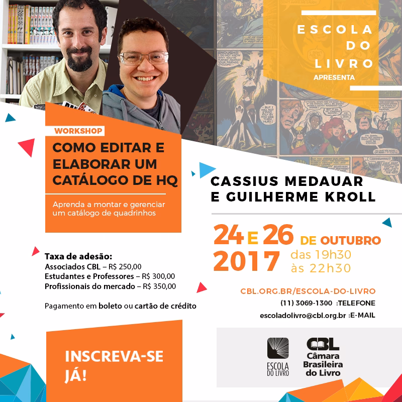 Dica boa pra quem quer trabalhar com quadrinhos: estão abertas as inscrições do workshop Como editar e elaborar um catálogo de HQ coordenado por Cassius Medauar, editor da JBC, e Guilherme Kroll, editor da Balão Editorial. São duas aulas, dias 24 e 26 de outubro, das 19h30 às 22h30, lá na sede da Câmara Brasileira do Livro. Segundo a página do curso, os encontros vão abordar “desde como se faz a elaboração de um catálogo até os meandros técnicos da edição de uma História em Quadrinhos com exercícios práticos”. Recomendo, viu? Você faz sua matrícula lá na página da CBL, clicando aqui.