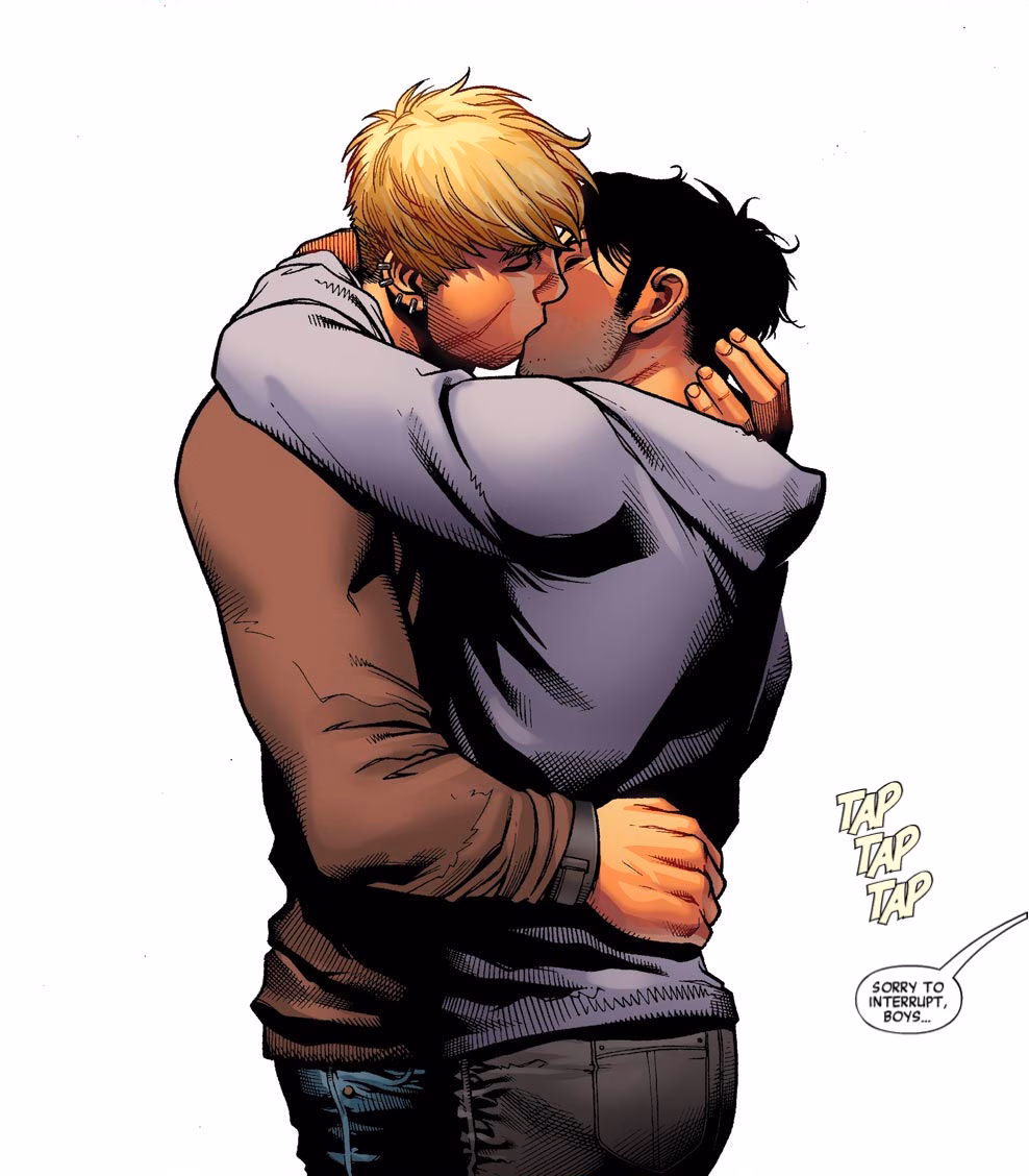 Fica o registro desse ataque à democracia e deixo a homenagem acima à obra de Allan Heinberg e Jim Cheung, publicada originalmente pela Marvel Comics em 2010, retratando o beijo dos personagens Hulkling e Wiccano, e apresentada como justificativa para a ação homofóbica do prefeito do Rio de Janeiro.