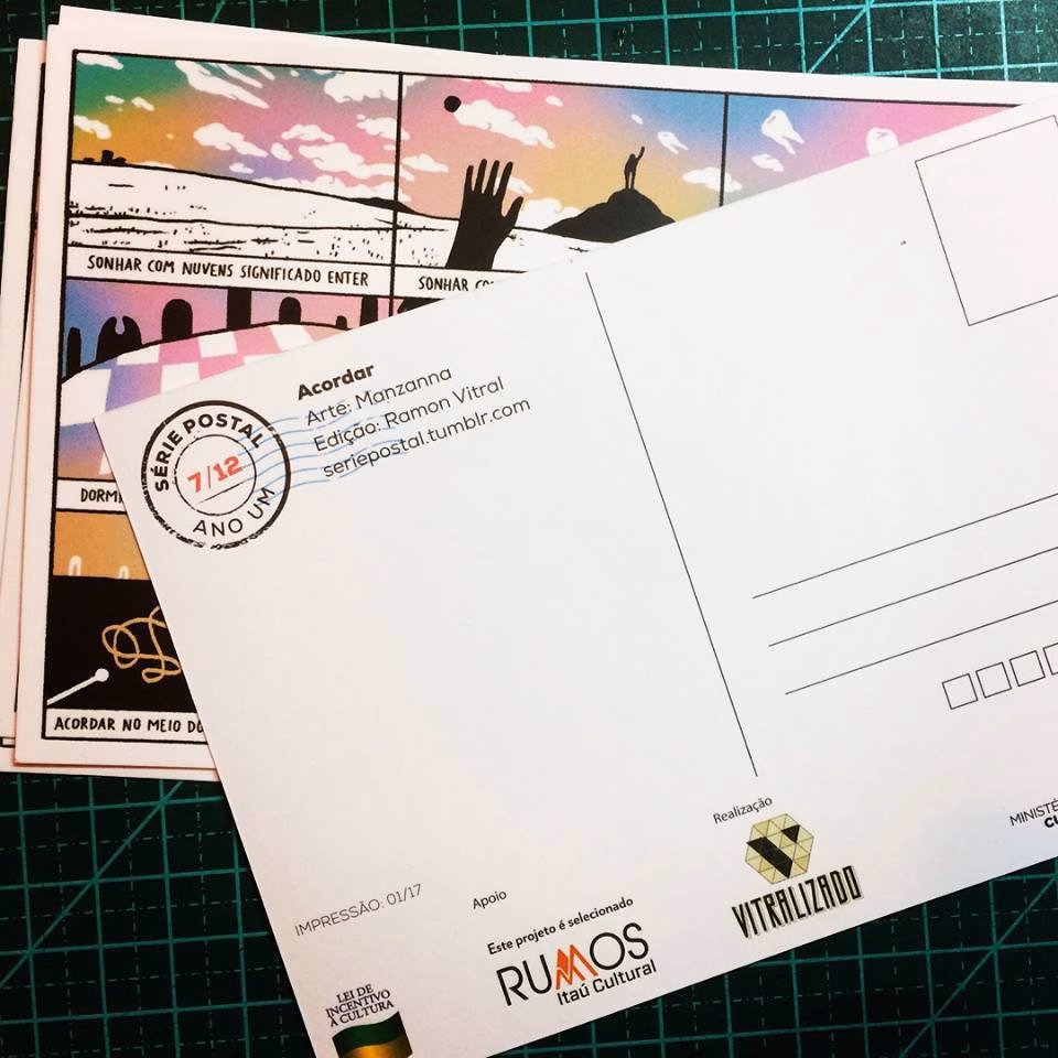 “Eu tenho feito muito quadrinho que não publico (risos) E eu estava nesse momento quando veio o convite para participar da Série Postal e fiquei matutando, pensando no que fazer pro postal. Foi uma hora em que deu pra dar vazão para algumas coisas que tenho tentado abordar e seguir mais no meu trabalho. Passa por uma coisa guiada pelo texto, mas não atrelada a ele, não literal, óbvio. Quadrinho que é legendado não me interessa tanto”