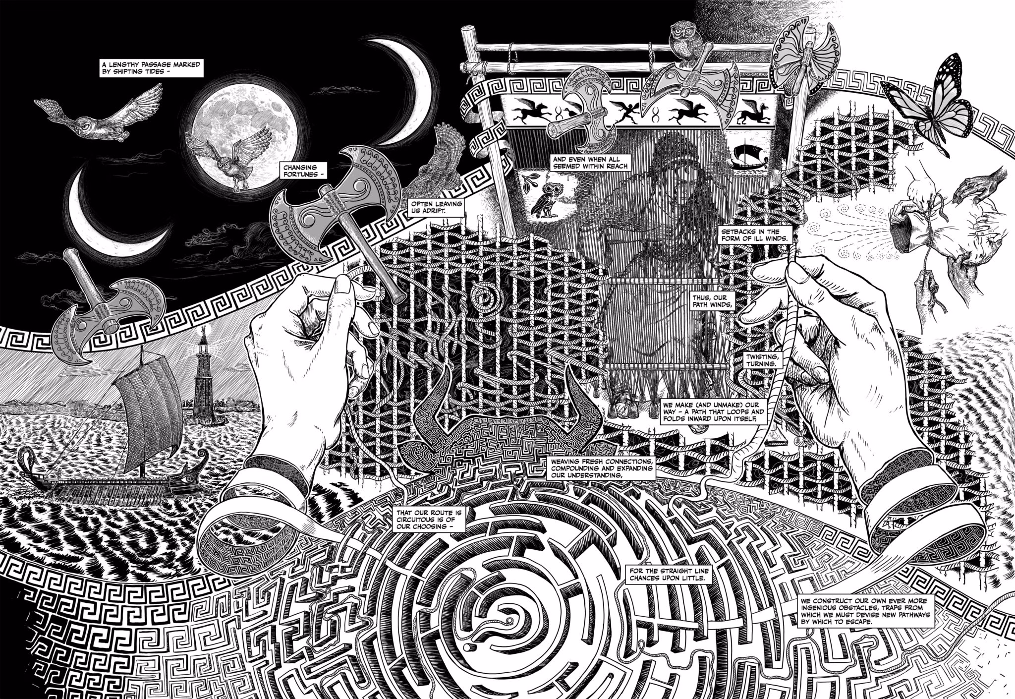 Aliás, na nossa conversa sobre Desaplanar em 2017 Sousanis já havia adiantado um pouco sobre o conteúdo dessa continuação. Ó o que ele disse: “Eu acho que se Desaplanar argumentou a favor da sua própria existência, esse próximo vai tratar do aspecto mais prático das coisas. Desaplanar era uma tentativa de pensar como o mundo e particularmente o ensino poderia ser para a minha então não-nascida filha. Dessa vez eu definitivamente fui afetado pela experiência de aprender com ela, assim como das minhas aulas e de querer ajudar as pessoas a reaprender a importância de fazer perguntas e a saber que são capazes de atos criativos. Eu vejo isso como algo muito mais criativo do que o primeiro e muito mais autocontido”.