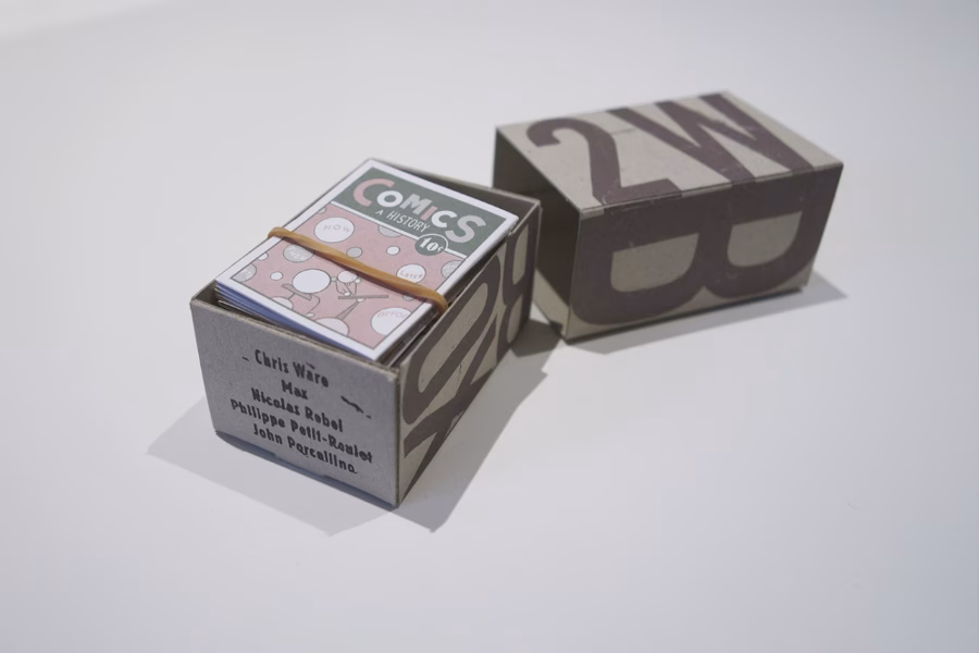 É meio impossível ter todos os trabalhos do Chris Ware. Ele costuma lançar edições de tiragens mínimas só pra alguns amigos, volta e meia faz uns pôsteres na camaradagem pra colegas, ilustra várias capas de revistas e livros e inventa umas modas que nem sempre chegam à internet – sim, ainda é possível que esse tipo de coisa aconteça. Daí que volta e meio jogo o nome dele no tumblr pra ver o que acho. Hoje esbarrei com uma página no ar desde junho de 2014, de um sujeito que coleciona os trabalhos do quadrinista. Claro, o foco por lá não tá nos livros, que são moleza de achar pelo mundo todo (menos no Brasil… tsc, tsc). O cara publica algumas fotos de itens nada fáceis de ver por aí. E outra, o sujeito é fã de carteirinha e aparentemente costuma viajar pra encontrar o autor. Tem vários itens autografados no site. Sério, clica aqui. Reproduzo algumas peças da coleção, mas recomendo entrar na página pra ver a história e a origem de cada um.