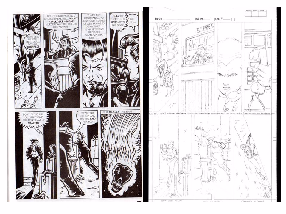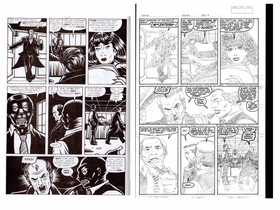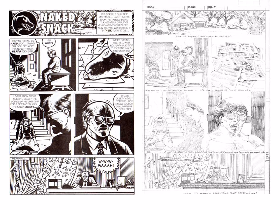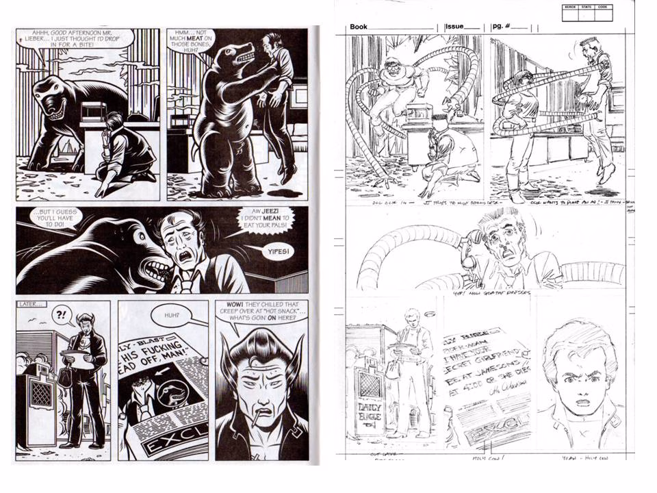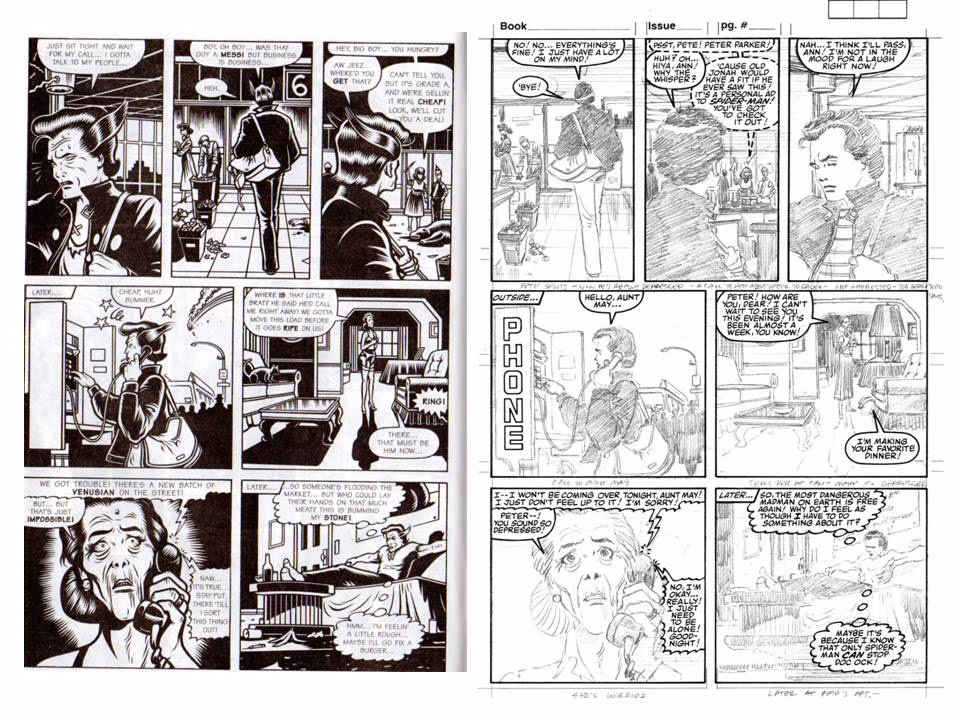 Só que o mais legal disso tudo foi que alguns anos depois o Charles Burns investiu na brincadeira da Marvel. Ele redesenhou as páginas do Romitinha substituindo Peter Parker, seus amigos e antagonistas por pessoas e criaturas dentro do ‘estilo Burns’. O resultado final foi publicado ao longo de duas edições da antologia Buzz da hoje extinta editora Kitchen Sink Press. Alguns anos depois, o cartunista Ben Towle colocou em seu tumblr as páginas do artista original e de Burns lado a lado e, putz, que pena da Marvel. Reproduzo por aqui as comparações das dez páginas de cada artista. Coisa bem foda. Dica do Rogério de Campos (valeu!). Saca só: