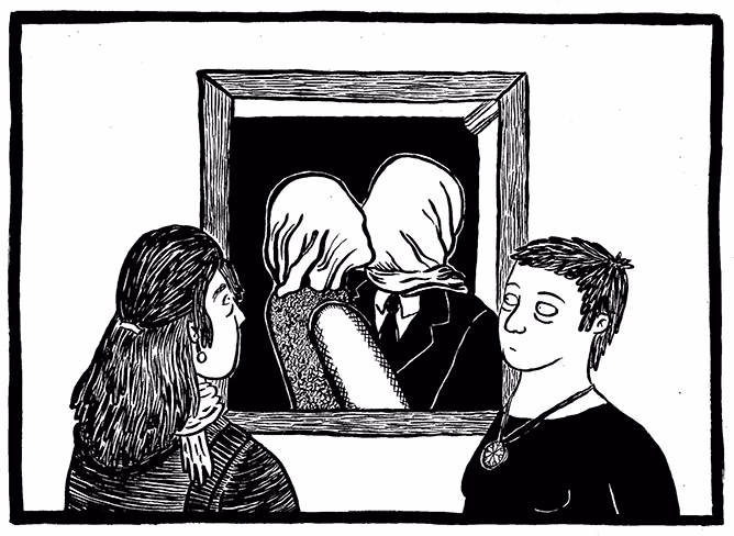 O que veio antes foi a história. Há bastante tempo eu queria fazer um quadrinho sobre observar pessoas em museus – eu gosto bastante da temática, genericamente falando, dos bastidores. Perceber o estranho presente nas pequenas coisas que a gente faz todo dia, reconhecer esse silêncio confortável daquilo que acontece por detrás dos panos para que outras coisas legais possam acontecer. Gosto muito de pensar nesses tipos de histórias – sobre cochias de teatro, funcionários de museus, pessoas geralmente escondidas. O trabalho do Magritte me veio depois, de forma natural, pois sou apaixonada (obviamente, haha!) pelo seu modo de olhar as coisas.