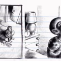 O uso do preto e branco para mim remete muito ao universo do quadrinho underground e alternativo. Tanto por ele ser financeiramente mais viável – então muitos zines vão ser em preto e branco porque é mais barato de imprimir -, mas tem a ver também com a linguagem. Acho que permite que algumas composições sejam um pouco mais agressivas. Não sei se é “agressiva” a palavra, mas dependendo de como você usa as hachuras, os conjuntos de luz e sombra, acho que você consegue transmitir um desprendimento maior, uma ideia de subversão. Não necessariamente precisa ser algo punk, mas existe um pouquinho de irreverência no preto e branco. É até um pouco difícil explicar o que exatamente causa isso. Acho que é o conjunto, é o contexto. Muitos autores que me inspiraram usam essa linguagem, como a Satrapi, os próprios autores da MAD que eu tinha comentado, alguns autores franceses também. Mas acho que tem a ver com esses fatores: a linguagem que foge um pouco do mainstream e algo que nos força a não publicar colorido, que depende de quanto você pode gastar ou não na sua autopublicação.