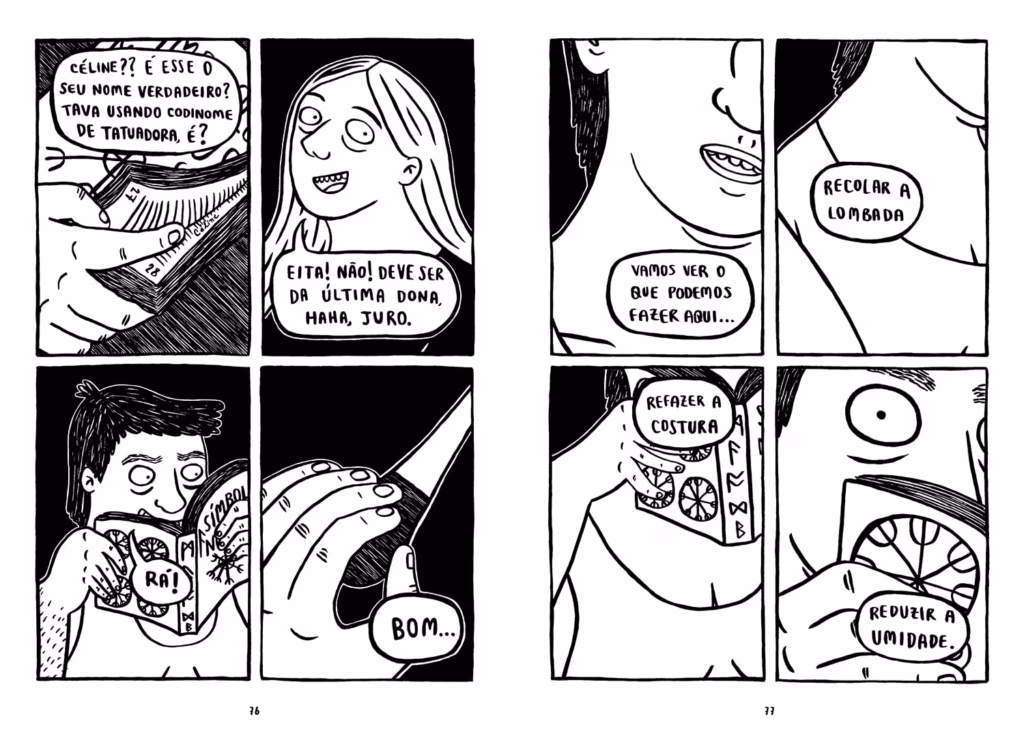 Eu me interesso por esse tipo de narrativa que só foge um milímetro da realidade, sabe? Como se o problema da Clarice tivesse algo de simbólico mesmo, de quase mágico e que não pudesse ser resolvido de forma prática. Me interessa essa mistura de terrenos. Também tem a ver com essa questão de que tatuar é o mundo dela, a função dela, o trabalho, o jeito dela de estar no mundo. O fato dela própria não conseguir vivenciar isso, acho que tem muito a ver com… Como eu posso dizer? Com uma certa dificuldade de ser você mesmo, de se inserir no seu próprio mundo. Tem a ver com uma forma de narrar um drama pessoal. Como uma narrativa precisa apresentar um problema que será resolvido, acho que essa é considerada a base de toda narrativa, né? Eu me interessei em criar esse problema da Clarice de forma que a solução dele fosse muito subjetiva. Sem querer dar muito spoiler da história, mas eu gostei de ficar numa construção que não fosse preto no branco, com o perdão do trocadilho.