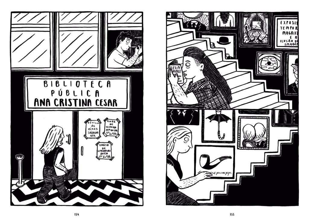 Tipo, a forma como a gente reutiliza essas obras pode criar novos significados, mas não de um jeito vazio. Acho importante não só mostrar outro livro, mas tentar fazer um uso produtivo dessa comunicação com outras obras, essa intertextualidade. Fora isso, ela é muito importante para mim pelo fato do contexto dela, né? Dos quadrinhos terem começado como muito alternativos e underground, já representando uma comunidade que na época era muito mais sub-representada do que é hoje. Então tem essa parte também, que para mim é muito especial e muito inspiradora. Tanto que a [escritora, pesquisadora e tradutora] Natalia Polesso, que chamei para fazer o blurb do livro… Chamei ela e a Laerte, né? Mas a Natalia até fez essa brincadeira. Tipo, “às vezes eu gosto de falar que a Aline é a nossa Alison Bechdel brasileira”, mas não é por aí e tal. Então eu sempre fico muito feliz, quando faz essa comparação. Tipo, eu tento criar a minha narrativa, do meu jeito, mas é muito difícil não transparecer as referências que a gente tem, né?