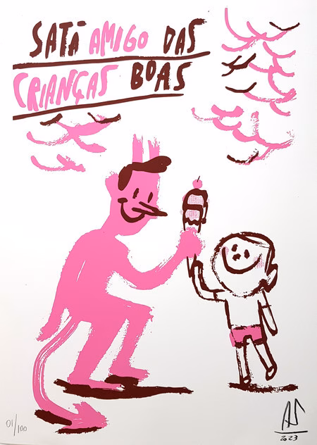 Foi o Rafael, que eu conheço há muito tempo, de Porto Alegre, que me propôs esse livro, baseado em uma serigrafia que eu vendo, Satã Amigo das Crianças Boas, com um diabo dando um sorvete para uma criança. E ele me propôs, ‘vamos fazer um livro a partir disso’. Aí eu fiz uns versinhos meio canhestros, umas rimas. E o Rafael, nossa, ele destruiu, né? Ele tá com desenho muito, muito sofisticado. Eu fiquei muito feliz com esse resultado.