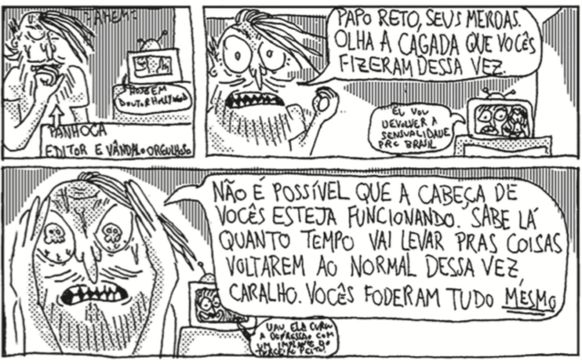 Hahaha, acho que já respondi um pouquinho na pergunta sobre a HQ ser terapêutica, mas a resposta é não. Embora eu sinta um ódio gigante quando penso na situação do país e nas pessoas que elegeram Bolsonaro, e mais ainda nas que seguem apoiando o governo, eu realmente gosto dos meus personagens. Me fazem lembrar, por exemplo, da minha relação com meu pai – um homem muito simples, muito amedrontado pela mudança dos tempos, pela alteração de um mundo que ele foi criado para achar que era seu reino. Ele não sabe mais como funcionam as relações e às vezes ergue um muro de fúria e machismo em torno de si mesmo. Passei muitos meses sem conversar com ele, logo após as eleições de 2018. Agora, voltamos a nos falar, com um pouco mais de abertura e compreensão. Eu me sinto um pouco conversando com meu pai quando desenho esses personagens; me vejo tentando compreender que tipos de extremos levam uma pessoa a apoiar um genocida no meio da maior crise sanitária e humanitária das últimas décadas. Acho que é mesmo um lugar de muito medo, o dessas pessoas. E eu gosto de tentar desvendar isso e de, talvez, nutrir esperanças por uma mudança de pensamento, como tem rolado com meu pai. Mas, lógico, tem momentos em que eu gostaria muito de jogar esses personagens pela janela…