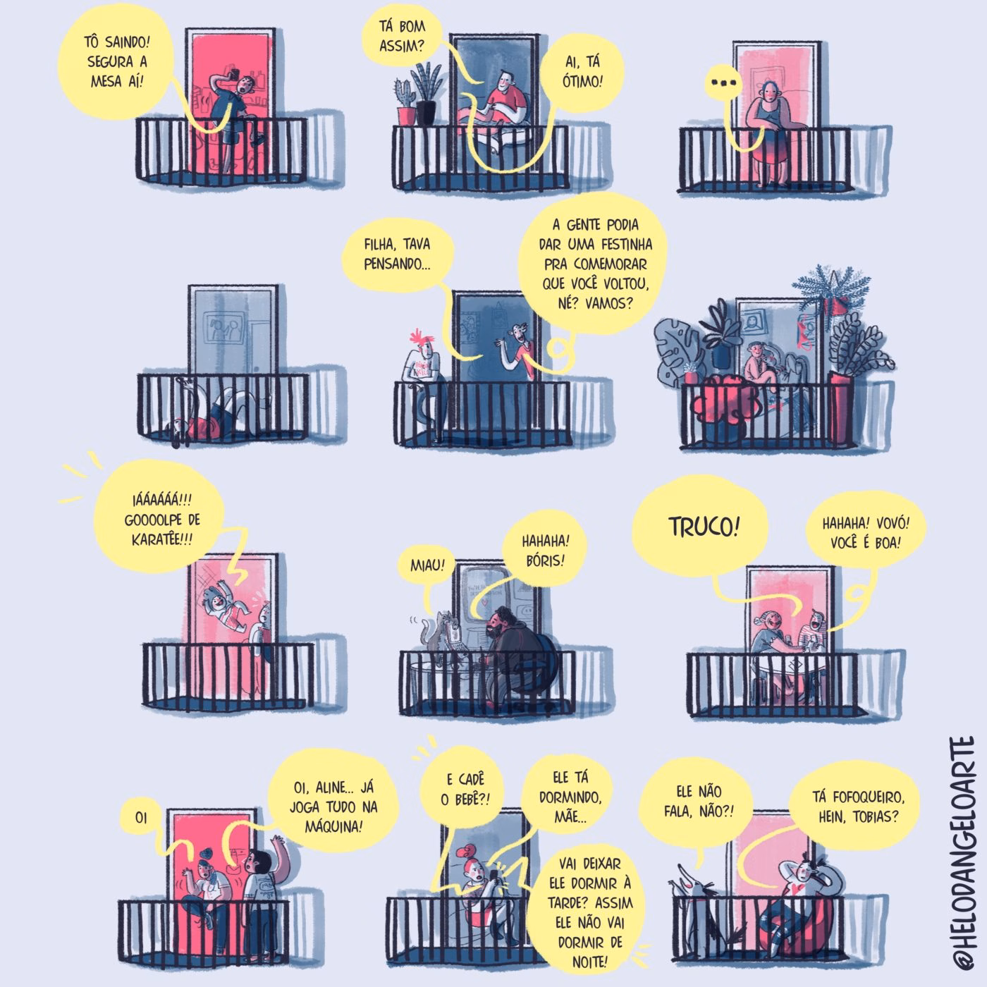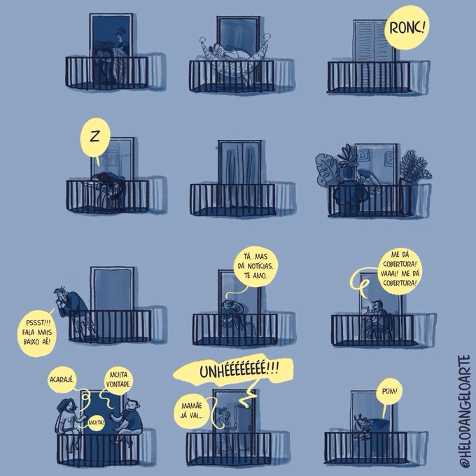 Que boa pergunta! Com certeza, muito da inspiração para a HQ vem de outras fontes que não os vizinhos em si. E como passamos muito tempo pendurados nessas “janelas” das redes sociais, acredito que muito das histórias vindas das redes se derrama para Isolamento. Principalmente as histórias mais gerais, como o sentimento das pessoas naquele momento específico – um período de muitos panelaços, ou um período de recorde de mortes, por exemplo -, e algumas específicas, como a de uma blogueira que, ao ser cancelada, começa um caminho de autocuidado e terapia. Pra citar Drummond, acho que são vários sentimentos do mundo que eu desenho na HQ, e como o mundo está restrito às janelas (reais ou virtuais), acabo usando o material que chega para mim.