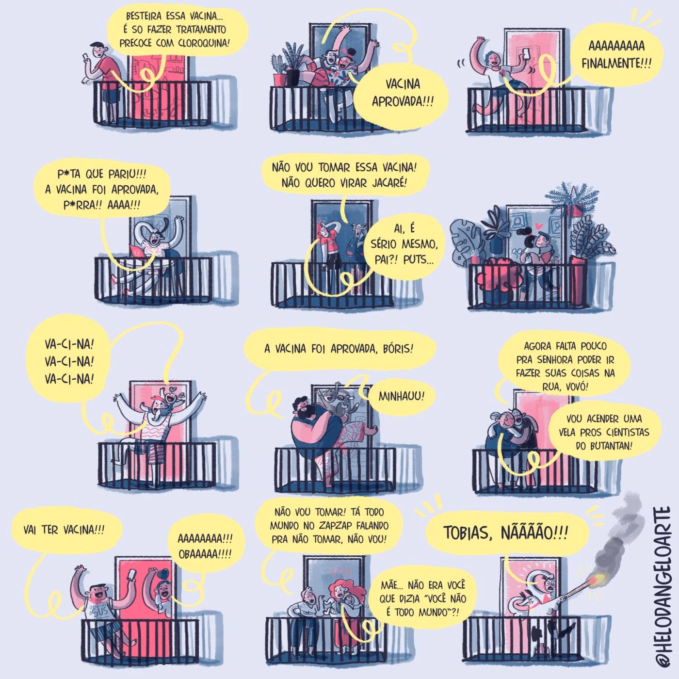 Na primeira temporada, eu desenhei 24 episódios direto, adiantados. E era isso. Ia postando aos poucos e a realidade não estava se movendo com tanta rapidez, então deu tudo certo. Quando cheguei à segunda temporada, comecei a desenhar furiosamente e meu namorado, Luis, disse “Xi… agora, você vai ter que prever o futuro”. Eu ri, mas de fato me deparei com o problema da realidade estar mudando a cada semana. Eu não podia, então, adiantar tantas semanas da HQ porque, de uma semana para a outra, saía uma vacina. Ou começava um BBB e as dinâmicas relacionadas ao programa, começavam panelaços, enfim, coisas que eu não podia ignorar. Então, fiz um roteiro-base bem simples para cada janelinha e adiantei o que era possível. O resto estou criando conforme a realidade avança, e algumas coisas eu mudo ao longo do caminho: desenhei a vovó, que mora com o neto, sendo vacinada; contaminei o Marcelo, morador da cobertura que não para de dar festas na pandemia; desenhei o esperado parto de uma das personagens… Pra mim, é uma forma nova de fazer HQ: em geral, tenho um roteiro pronto e faço poucas mudanças ao longo das postagens. Tem sido estranhamente libertador.