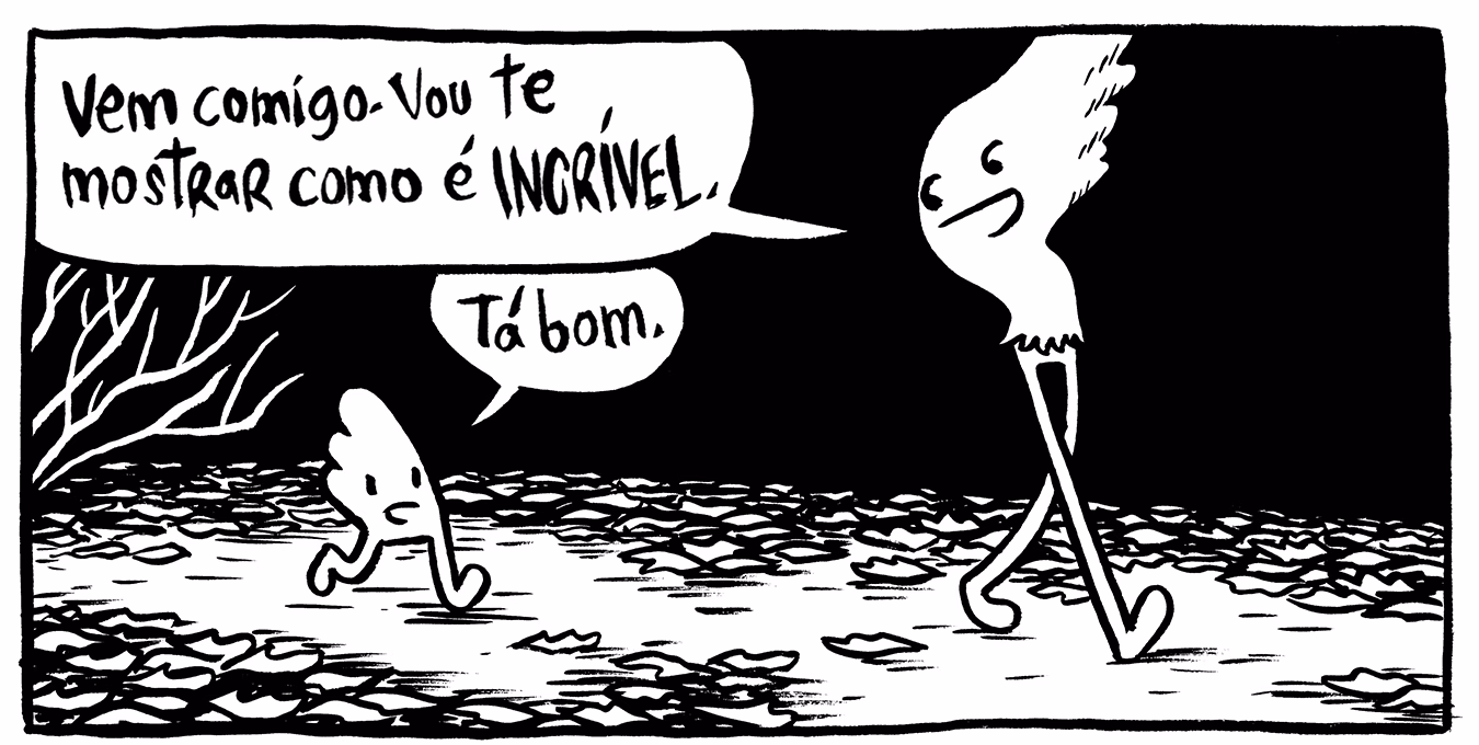 Fiz uma pesquisa de campo em alguns lagos sazonais do Maine, formados quando a neve derrete e as folhas do outono agem como uma espécie de forro que sela o chão e impede que a água desapareça pelo solo. São ambientes que podem existir ao longo de meses e abrigar várias criaturas, como sapos e salamandras. É como uma festa gigante, bem barulhenta, mas assim que você chega perto eles ficam quietos. É muito divertido imaginar o que pode estar rolando por lá enquanto não estamos presentes. Essa foi a inspiração para a primeira história do Fungos e depois segui adiante.