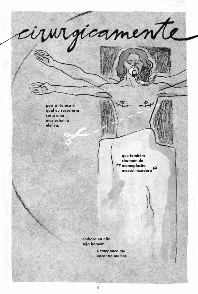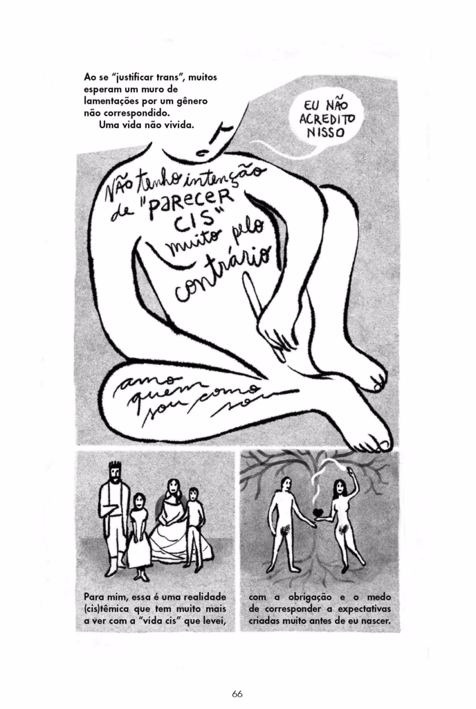 Eu sou uma pessoa muito realista. Para a produção do quadrinho, eu sabia que eu tinha um tempo limitado para produzir uma história com começo, meio e fim. Então deixei o que fazia sentido dentro da narrativa. Agora, o que eu estava vivendo é um pouco diferente disso, né? Porque eu sinto que a questão trans, infelizmente, está muito em disputa agora. Está sendo um grande tema de disputa, inclusive da extrema direita. E eu acho que isso foi uma coisa que ocupou muito a minha mente nesse período, de forma negativa, obviamente. Do tipo, eu me preocupei muito com essas questões enquanto estava perseguindo uma coisa que é muito relevante para essas questões também. Nesse meio tempo, também briguei com pessoas por causa disso. Não por causa do meu corpo, necessariamente, mas por causa dessas questões que atravessam o meu corpo, né? Mas também por causa do meu corpo.