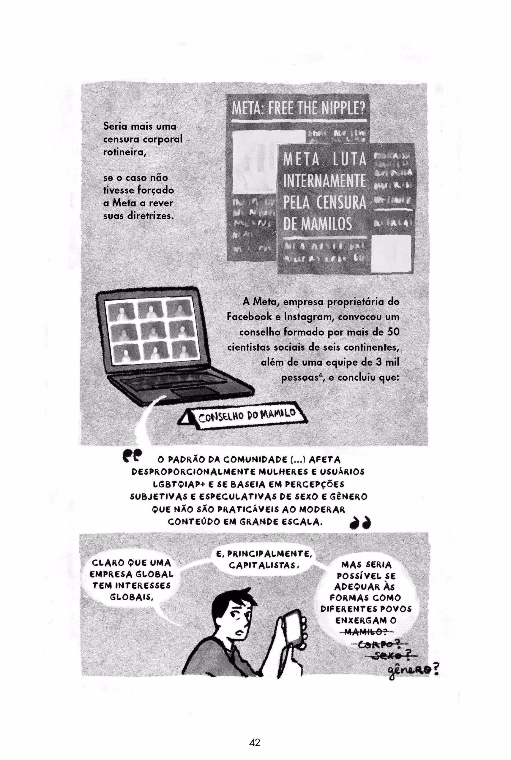 Sim, teve uma parte que eu fiquei “caramba, cheguei aqui, queria falar de outra coisa, mas não está dando liga”. Não lembro direito mais onde foi, era mais para o finalzinho. Mas até considerei botar mais páginas no livro para ver se dava certo. Acho que tive que redesenhar a página. É confuso desenhar pensamentos. Foi muito cansativo fazer esses desenhos.