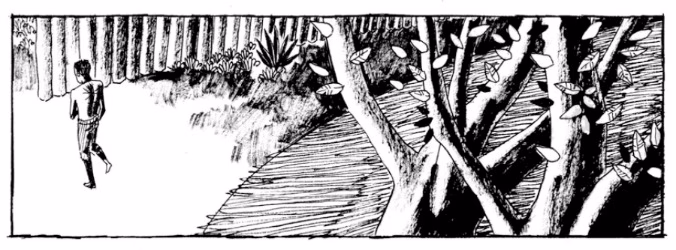 Esse é um recurso usado por diversos autores. Talvez seja uma influência do cinema também. Tenho dificuldade em pensar a construção da página de quadrinhos de outro modo. Considero monótono trabalhar com o personagem em plano inteiro. Muitas vezes, num quadro, ideias podem ser sintetizadas a partir do foco em objetos ou pequenas ações. Por outro lado, é preciso abrir o plano para situar melhor a ação e fornecer mais elementos ao leitor. Gosto de usar esses recursos ao construir as páginas.