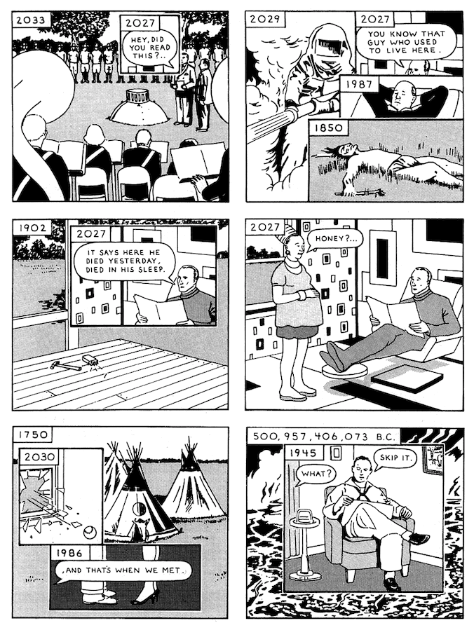 Foram algumas etapas. Eu tinha acabado de me mudar para um apartamento, isso em 1988, e estava pensando em quem havia morado lá antes de mim. Eu tive a ideia de fazer um quadrinho que ficava indo e voltando no tempo. Eu escolhi o canto de uma sala porque poderia funcionar como uma tela dividida, como você vê de vez quando em filmes, de forma que o lado esquerdo fosse para frente e o lado direito para trás. Fiz alguns esboços simples. Depois um amigo me visitou e contou do computador dele com esse programa chamado Windows, foi quando ficou claro que eu poderia usar essa estrutura de janelas para mostrar múltiplas perspectivas do tempo simultaneamente.