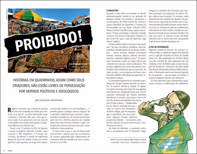 O tema nasceu lá atrás, antes de lançarmos a campanha no Catarse pra #1. 2019 marcou o aniversário de cinquenta anos do nascimento de O Pasquim, o maior ícone da contracultura e do jornalismo alternativo nacionais. Então, era meio que uma “obrigação” falar disso de alguma forma. E O Pasquim foi um símbolo do engajamento político contra a ditadura e a favor da liberdade de expressão. Portanto, as matérias deveriam focar em questões como censura, produção em períodos de intolerância etc. Curioso que, conforme os meses foram passando e a gente começou a escrever essas reportagens para a #2, vários assuntos surgiram pra dar mais força ainda a esse tema: a tentativa de censura do prefeito do Rio de Janeiro contra um simples beijo gay num gibi dos Vingadores durante a Bienal do Livro, a absurda campanha “Quadrinhos Sem Política”, surgida pra bater de frente com o movimento “Quadrinistas Antifascistas” e outros. Vale ressaltar, né: quem confunde antifascismo com ideologia provavelmente é analfabeto político – ou mau caráter.