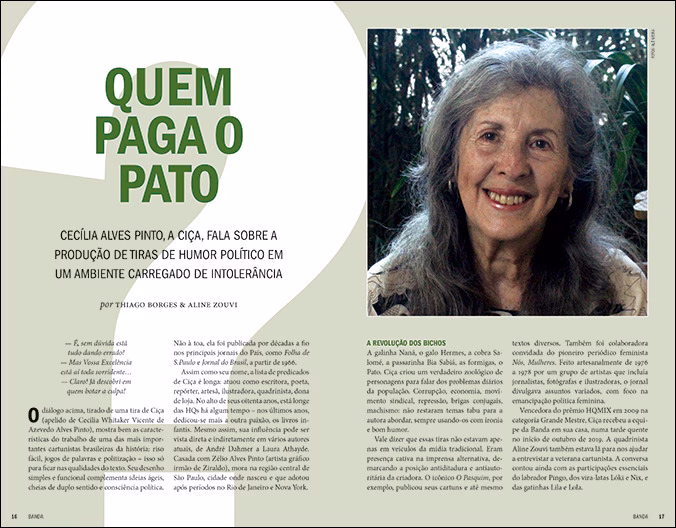 Foi realmente encontrar assuntos relevantes atuais sobre a relação entre gibis e política. Não queríamos focar em coisas manjadas desse tema, como Watchmen, V de Vingança etc. A ideia era pensar a respeito de um ponto de vista brasileiro, pegando O Pasquim como ponto de partida para chegar a questões contemporâneas, como as tentativas recentes de censura por aqui, a interação com leitores facilitada pela internet (e também o ódio propagado contra artistas), a tendência cada vez mais reacionária da tal “cultura nerd”… Por isso mesmo, a entrevista com a Ciça é muito importante. Mostra quem esteve lá, contra a opressão da ditadura, fazendo humor gráfico em prol da liberdade de expressão.