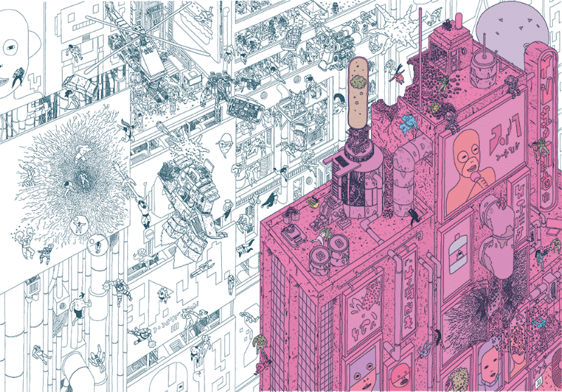 “A PARAFUSO ZERO – Expansão surge a partir do momento em que conversamos sobre fazer o bookplate pro evento de lançamento da PARAFUSO 0 na loja da Ugra, em São Paulo, em março de 2018. Logo quando comecei a fazer pensei que seria legal voltar a trabalhar nesse universo. A partir daquele momento, a ideia já não era ser uma continuação do álbum anterior. A ideia era pegar aquele universo e seguir com ele, contando outras histórias. Isso tudo veio pra valer no momento em que eu estava desenhando o bookplate. A PARAFUSO 0 tinha saído em dezembro de 2016 e desde então eu não tinha feito nenhum desenho desse universo, tirando nos autógrafos que as pessoas pediam e tal. Então, nesse momento, deu essa luz: quero fazer uma expansão desse universo.