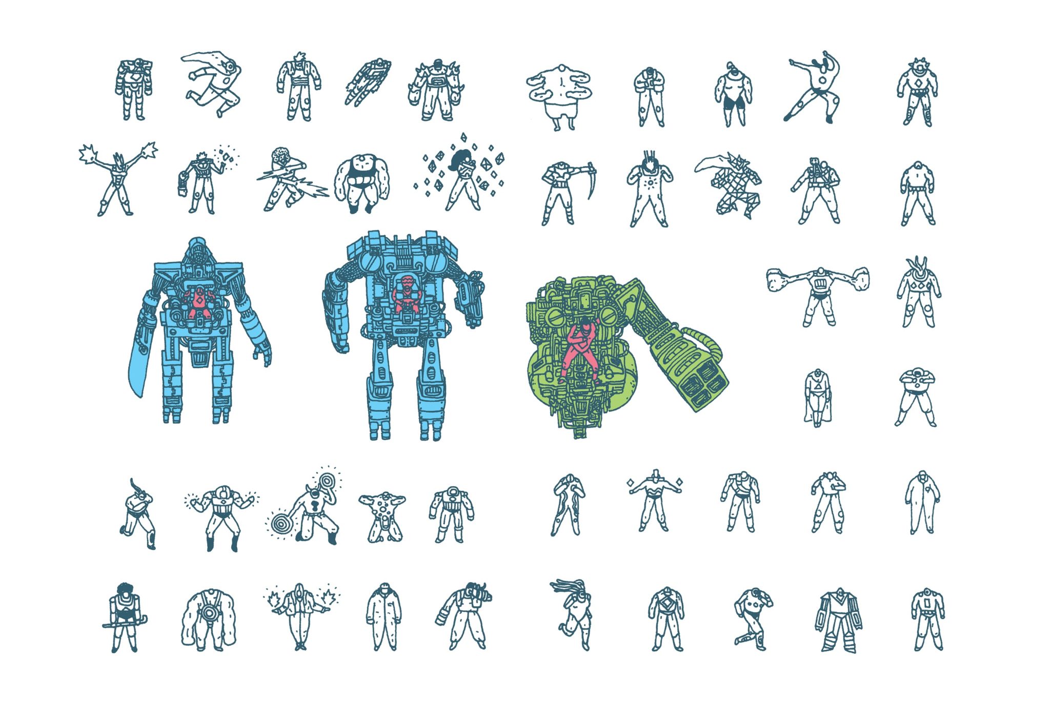 Isso também tem a ver com o processo de desenho desses personagens. Eu tenho cada vez mais pirado em manuais e infográficos. Esse é um tipo de exercício e criação que tô achando muito legal, ver a página com esses bonequinhos, tô gostando e nunca tinha parado pra fazer. Tô pirando cada vez mais. Talvez no futuro o meu trabalho vá virar um grande manual de alguma coisa que não tem utilidade alguma (risos)”.