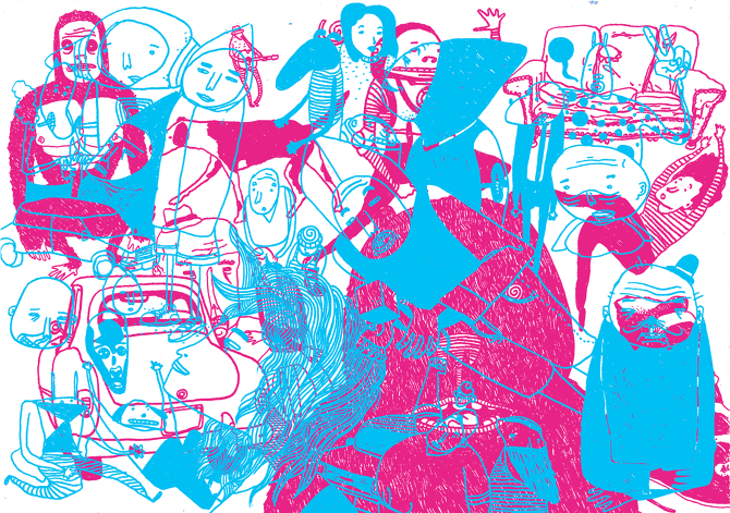 Eu tinha uns pesadelos e comecei a dar uma estudada nessa parada e isso tudo acabou me ajudando. Sei lá, eu tinha um pesadelo com alguém correndo atrás de mim, uma coisa assim, aí eu lembrava do rolê de olhar pra mão, eu olhava pra minha e voava, deixava o que estava me perseguindo pra trás. Umas paradas meio esquisitas. Nesse rolê de trabalho teve o sonho que inspirou a revista PARAFUSO e agora eu tô lembrando de um outro sonho que influenciou a PARAFUSO ZERO – Expansão, uma história que alguém fez no meu sonho nesse formato grandão, era um quadro só pegando as duas páginas. Era uma cena mostrando dentro de um ônibus, com as pessoas sentadas e rolando um quebra pau. Tinha, sei lá, oito páginas a história e isso é algo que eu tô querendo fazer, sabe? Uma câmera estática dentro de um ônibus e a galera brigando lá dentro (risos)”.
