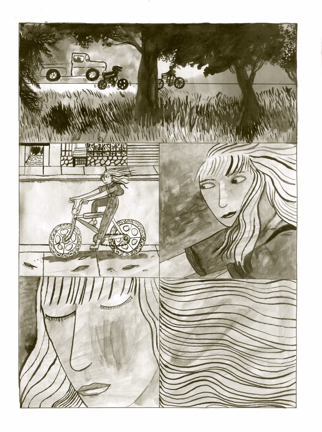 “Sempre me proponho usar técnicas diferentes e novas em cada livro, técnicas que tenham relação com a história e a narrativa”, explica a artista. “Fiz este livro todo com tintas preta, amarela e vermelha, algo completamente novo para mim. Queria que fosse como se a bicicleta tivesse pisado uma poça cheia de lama e tivesse desenhado tudo com os pneus”.
