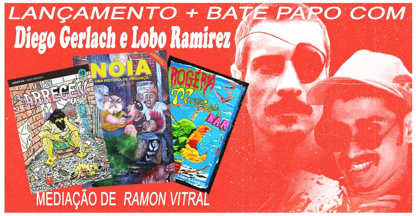 Sério, caras, anotem aí, essa é imperdível: no sábado (15/7), a partir das 15h, estarei mediando uma conversa com os quadrinistas/editores Diego Gerlach e Lobo Ramirez na loja da Ugra aqui em São Paulo. No mesmo dia estarão sendo lançados os excelentes Arrecém (12ª edição da coleção Ugritos), Nóia – Uma História de Vingança! e o terceiro número da revista Rogéria e os dois convidados vão falar sobre suas respectivas obras e também das atividades do selo Escória Comix.