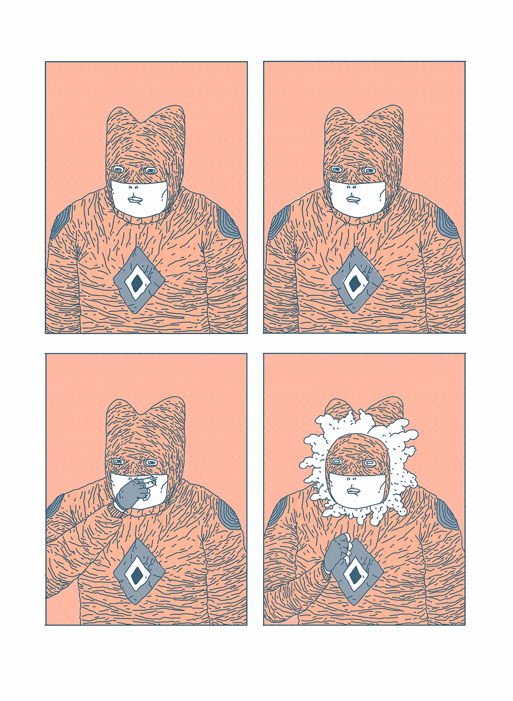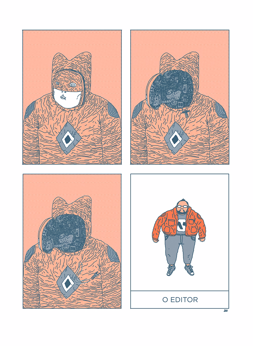 “Com o objetivo (nada discreto) de fazer a história em quadrinhos de super-heróis mais estranha que já existiu, convidei um amigo querido para trabalhar junto comigo na edição da PARAFUSO 0 – Expansão. De uns tempos pra cá tenho sentido muita falta de alguém para editar o que tenho feito, como uma forma de potencializar as ideias e as obras como um todo. Muito do que fiz até hoje foi a partir de um processo solitário, tateando no escuro para alcançar certos lugares. Contudo, ter mais uma cabeça para pensar a construção geral de uma narrativa, no momento em que estou, faz-se fundamental: primeiro porque entrei num terreno desconhecido e segundo porque, após tantos anos fazendo tudo sozinho, percebo que também tenho que aprender a me abrir para as trocas de experiências, que, certamente, são como uma chave para atingir novos ambientes com minha produção. Enfim, já iniciamos a jornada, já abandonei muitas ideias e diversas outras chegaram chutando a porta e subindo o nível da coisa como um todo. Para seguir viagem, fiz esta pequena sequência para apresentar o meu parceiro. Mas, assim como é a PARAFUSO 0, não entregaria a informação de bandeja pra vocês, claro. Pergunto, então: Quem é meu editor?