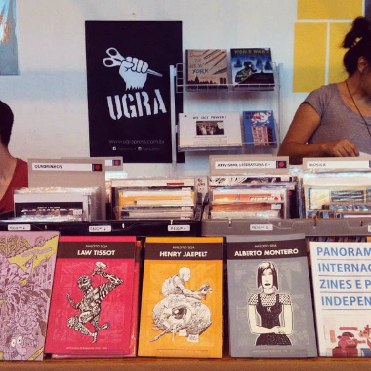 Então a Ugra começa como uma ideia de fanzine que virou um blog e aí depois a gente foi fazer o anuário. No final recebemos 125 publicações pro anuário, aí já era de 2009 pra 2010. Pra um negócio que parecia que tava morto, você receber 125 publicações, sinaliza uma outra verdade. A nossa teoria de que as pessoas nem sabiam que aquilo existia aparentemente tinha se comprovado. Então começamos a editar o anuário: todo o material que recebíamos era lido e resenhado. As coisas que a gente achava que eram mais legais, fazíamos uma entrevista rápida com os editores. Compilamos tudo isso e lançamos num anuário impresso. Quando a gente foi lançar o impresso resolvemos fazer uma festa igual quando lançávamos um fanzine. O default de lançamento de fanzine era isso, você chamava banda de amigo. A gente tinha uns amigos que tinham uma casa numa travessa da Augusta, chamava Espaço Impróprio, um lugar meio punk e tal, e eles toparam abrigar o lançamento. Você conhece o Rodrigo Okuyama? Ele faz um trampo sensacional, que mistura quadrinho e ilustração com estencil. A gente tinha recebido um zine dele, La Permura, e ficamos, “caramba, esse cara é muito bom”. Chamamos ele pra fazer uma oficina de encadernação manual e ele topou. Um pessoal do Rio tinha lançado e mandado pra gente um zine sobre vegetarianismo. A capa do zine era serigrafada. Eles ficaram sabendo da festa, quiseram vir pra conhecer a gente e pô, já que ele vinham, chamamos pra fazerem uma oficina de serigrafia em papel. Bom, aí já tínhamos três shows, uma oficina de encadernação e uma de serigrafia. “Pô, então podíamos fazer uma exposição juntando o material…”. Então a gente fez uma exposição com todo o material que a gente recebeu. O negócio foi crescendo assim e uma hora não cabia mais no Espaço Impróprio e não dava pra fazer em um dia. Então na sexta-feira a gente fez um show no Espaço Impróprio. Tinha uma galeria abrindo em Pinheiros, a Concreto, e no sábado eles receberam o resto das atividades. Resolvemos fazer uma feira, que era uma mesa não muito grande e cada um que chegava deixava um pouco de zines ali. A gente pagou todo mundo ali mesmo, tudo bastante informal. Daí surgiu a feira que a gente faz, o Ugra Zine Fest. Era só pra ser uma festa de lançamento. Aí 2010 a gente fez o anuário, 2011 lançamos outro, em 2013 a gente fez o terceiro, que foi o que ganhou o troféu Ângelo Agostini. De 2012 pra 2013 a gente começou a pensar o lance da loja.