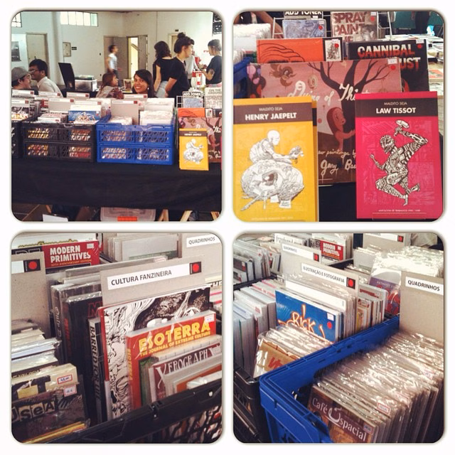 Eu tava de saco cheio do meu trampo, a Dani tava de saco cheio de trabalhar no banco, então resolvemos que um de nós dois ia sair do trabalho pra começar a tocar no negócio. Como naquele momento, nenhum dos dois queria continuar muito tempo no trampo que tava, a gente falou, o primeiro que conseguir sair vai levando a loja e a gente vê o que rola. A Dani conseguiu a demissão dela e puxou uma grana porque tinha um tempo que tava lá. Deu pra dar uma investida na loja e ele conseguiu se concentar nisso enquanto eu continuava no emprego. Foi isso 2013 e 2014. Em 2014 começou a ficar muito complicado de trabalhar durante o dia e a noite chegar, tomar banho, comer alguma coisa e ficar até 3h ou 4h…A Dani cuida mais dessa parte comercial, de fazer contato com os autores e pegar as coisas. Toda a parte de divulgação da loja eu que faço. Ainda tem as coisas que a gente publica. E tem o evento. Então tava difícil cuidar disso tudo. Consegui minha demissão no final do ano passado e nesse momento virou outra coisa. O plano é meio maluco. A ideia é fazer o negócio funcionar a ponto de sustentar uma casa. Agora faz seis meses que estamos os dois em casa cuidando 100% disso.