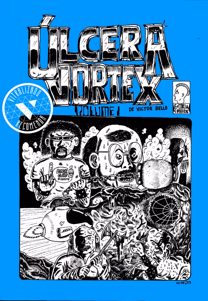 O primeiro volume da série Úlcera Vortex (Escória Comix) é centrado nos feitos do cientista Loépio de Deus e sua Máquina de Encolher. Por conta da invenção ele salva 970 mil pessoas com câncer e ganha o Prêmio Cadu Moliterno Science. A máquina também permite que um clone criado por Loépio entre em seu corpo para investigar um buraco negro interdimensional instalado em seu estômago que dá acesso à civilização Gorgonotúbia. Em um dos momentos mais tensos da trama, ainda são mostrados os feitos da lagartixa hacker Valdir Vegeta. É impressionante a quantidade de personagens fantásticos e de conceitos absurdos e originais que Victor Bello apresenta nas 36 páginas da HQ. Aguardo ansiosamente pela continuação.
