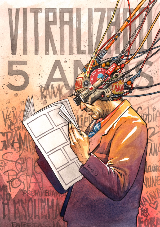 [[O quadrinista e ilustrador Gustavo Magalhães assina a arte de aniversário de 11 anos do Vitralizado. Nos próximos dias publicarei uma entrevista com autor sobre a produção desse trabalho e os bastidores da série No Meio Fio – publicada na newsletter Antes Que Eu Me Arrependa (e que recomendo a assinatura imediata). Você confere as edições prévias das artes de aniversário do Vitralizado ao final do post]]