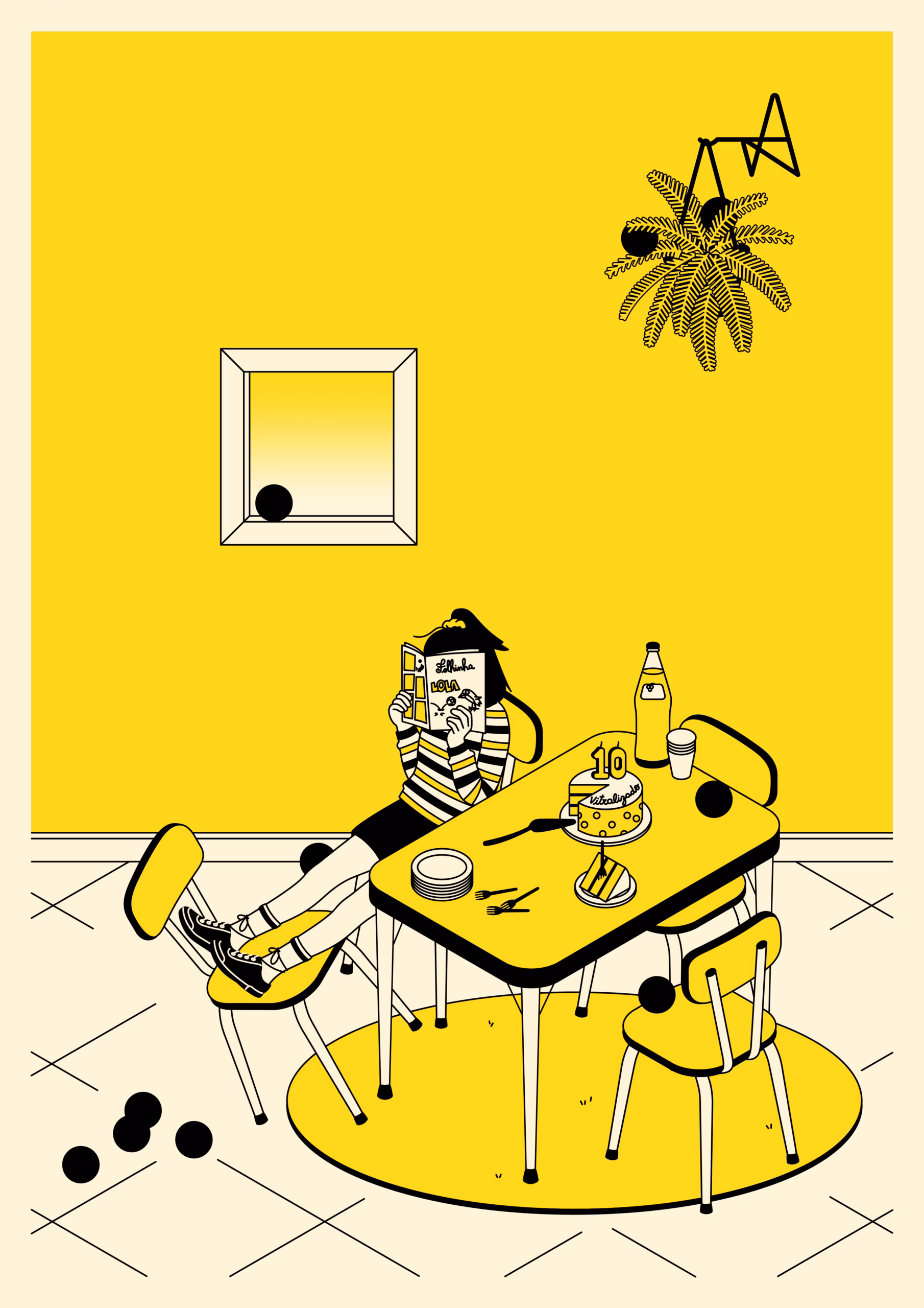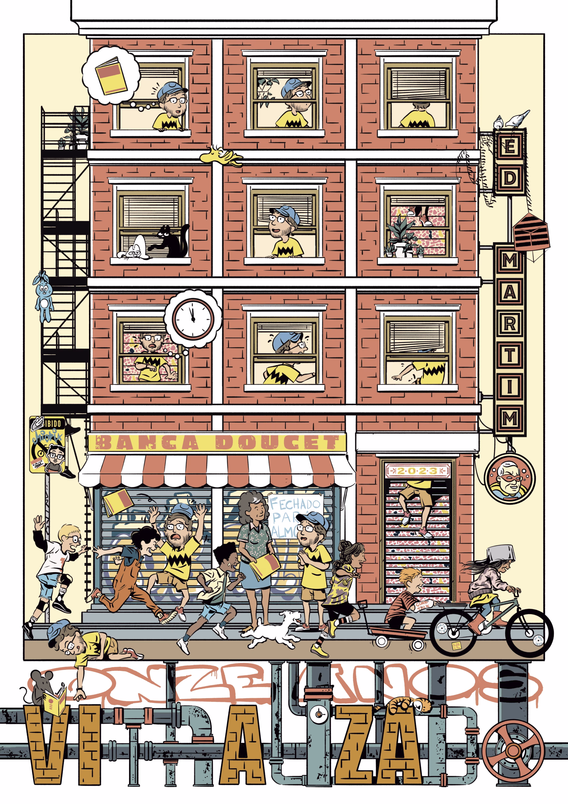 São tempos agitados e corridos, como o ritmo frenético da arte do Gustavo Magalhães nesse cartaz de 11 anos. Depois das ilustrações mais introspectivas da Deborah Salles (8 anos), do Galvão Bertazzi (9 anos) e da Grazi Fonseca (10 anos) nos três anos da pandemia, vejo certa poesia na “saída de casa” retratada na arte do 11º aniversário. Tem bagunça, alegria e criança. Mais ou menos como anda a vida por aqui.
