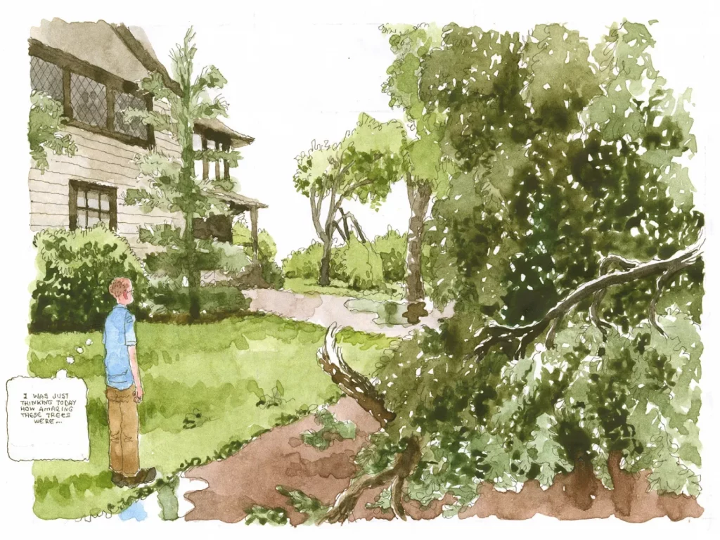 A New Yorker divulga suas capas junto com uma entrevista curta com os autores responsáveis pela arte. Na conversa com o Chris Ware ele diz que teve a ideia da ilustração ao lembrar de seu período vivendo em Oak Park, no Illinois, na época das eleições presidenciais entre Barack Obama e John McCain. Uma casa geminada da vizinhança tinha cartazes do candidato democrata de um lado e do republicano no outro. Na mesma entrevista o quadrinista também compartilhou um desenho de seu diário para falar sobre suas observações da árvore em frente ao estúdio dele que ajudaram nessa arte mais recente, ó: