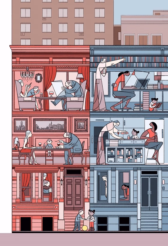 Enfim, também não é que a ideia é das mais originais. Só chama atenção por serem conceitos extremamente parecidos. No Twitter, uma pessoa ainda lembrou do trabalho aqui embaixo, do espanhol Sergio García Sánchez, também colaborador frequente da New Yorker. Sanchéz respondeu ao post contando que a arte foi proposta por ele para a revista em 2021, mas também acabou sendo recusada. Como escreveram no Twitter, poderia ser o interior das casas retratadas por Ware, saca só: