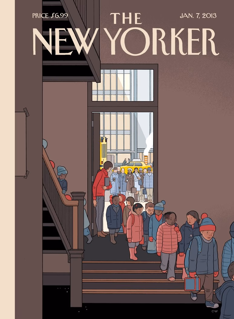 Na capa mais recente, o autor mostra uma menina desanimada enquanto é deixada na escola pela mãe. Em um depoimento sobre essa próxima arte para o site da New Yorker, Ware fala sobre a passagem do tempo e o crescimento de sua filha: “É clichê, mas é verdade: pais, quando seus filhos perguntarem, ‘você vai brincar comigo?’, brinquem. Porque um dia eles vão parar de perguntar, assim como você parou”. Leia a íntegra do depoimento por aqui.