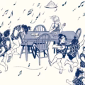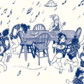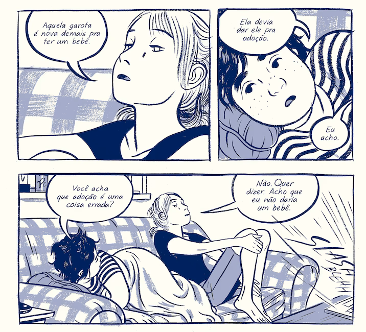 Eu escolhi em um catálogo Pantone na sede da First Second. A influência vem de mangás antigos, que às vezes se imprimiam em tinta azul escura ou roxa. Tem um pouco de mangá em Aquele Verão, mas, pra ser sincera, foi uma escolha barata, de estilo. Tem um pouquinho de melancolia nessa cor. E me pareceu que ia ser uma coisa singular da HQ – pelo menos na época.